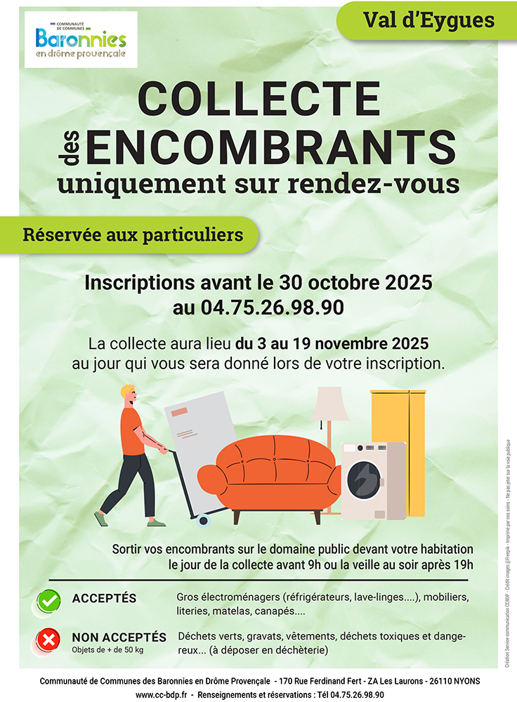Sur le Val d'Eygues, la collecte se fera entre le lundi 3 novembre et le mercredi 19 novembre 2025. Pour bénéficier du service, il est impératif de prendre rendez-vous auprès de la CCBDP avant le jeudi 30 octobre 2025 au 04 75 26 98 90.
