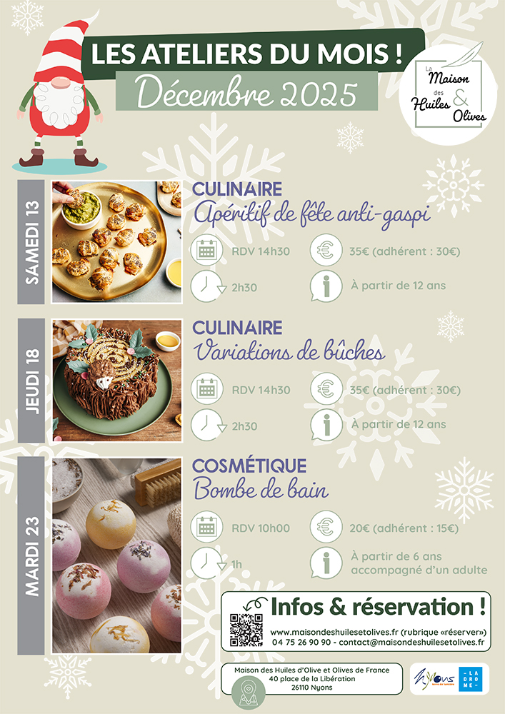Découvrez le riche programme de décembre proposé par la Maison des Huiles d'Olive et Olives de France, située au 40 place de la Libération.